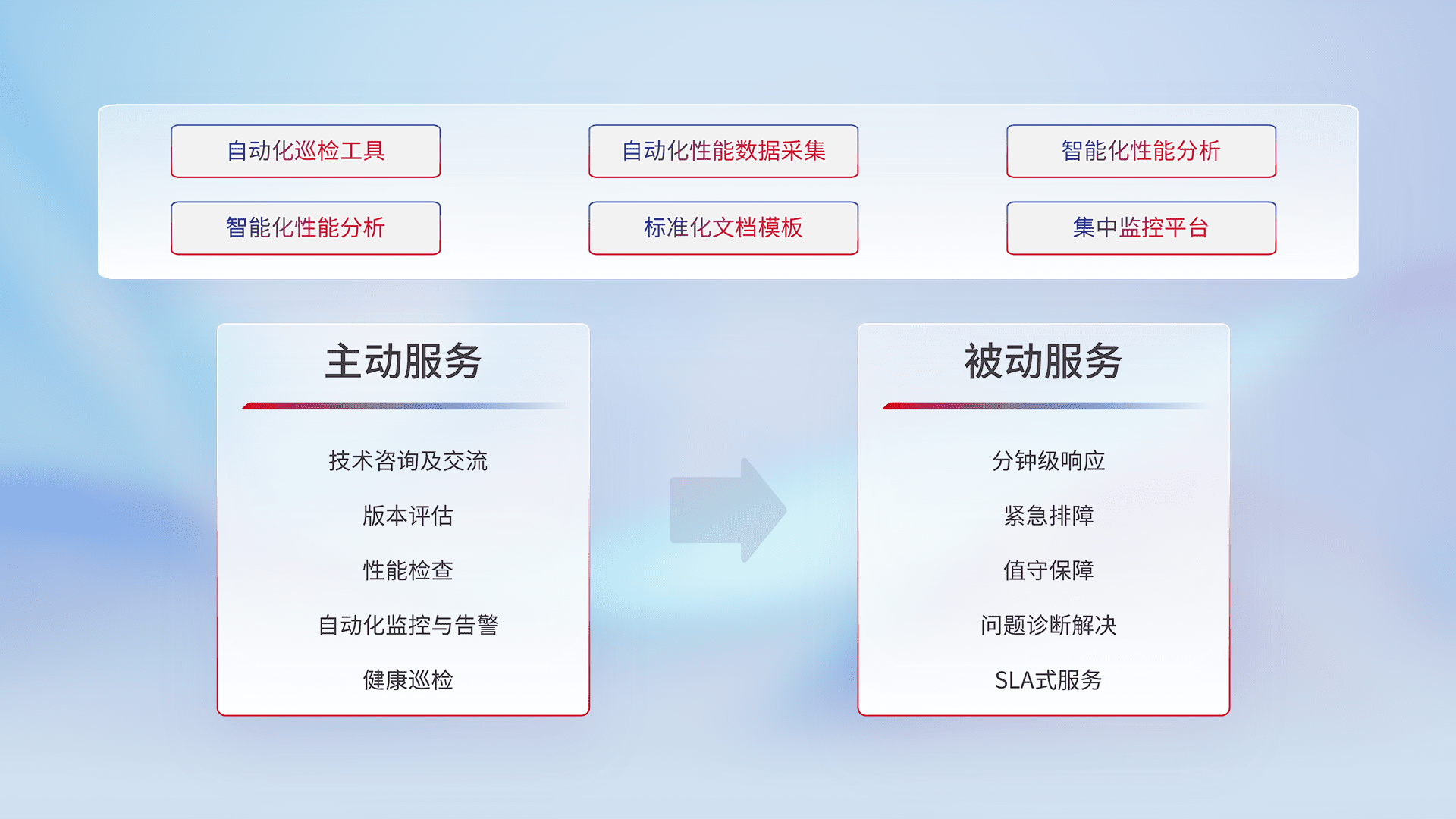 智能化工具和标准化文档,,,,保障服务质量,,,提供主动服务(包含技术咨询、、版本评估、、性能检查、、、自动化监控与告警、、、健康巡检)和被动服务包含(分钟级响应、、紧急排障、、、、值守保障、、、问题诊断解决、、SLA服务)。。。
